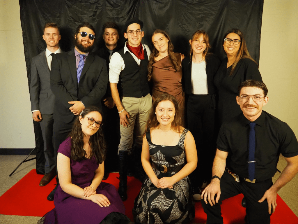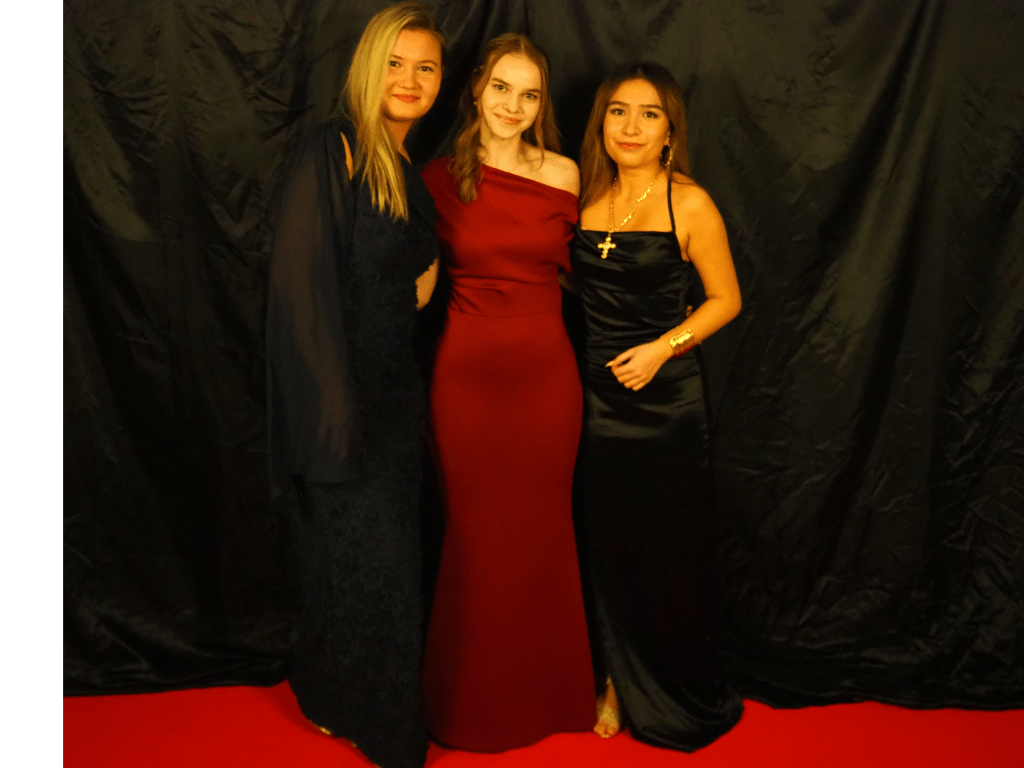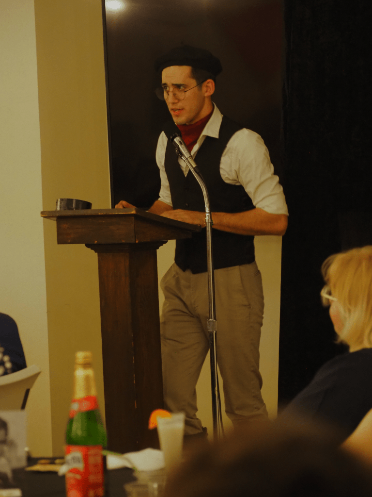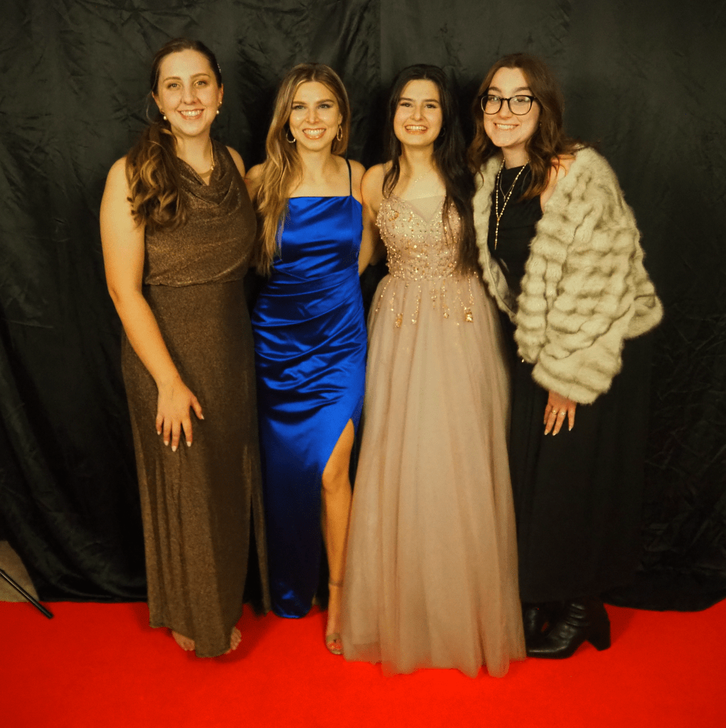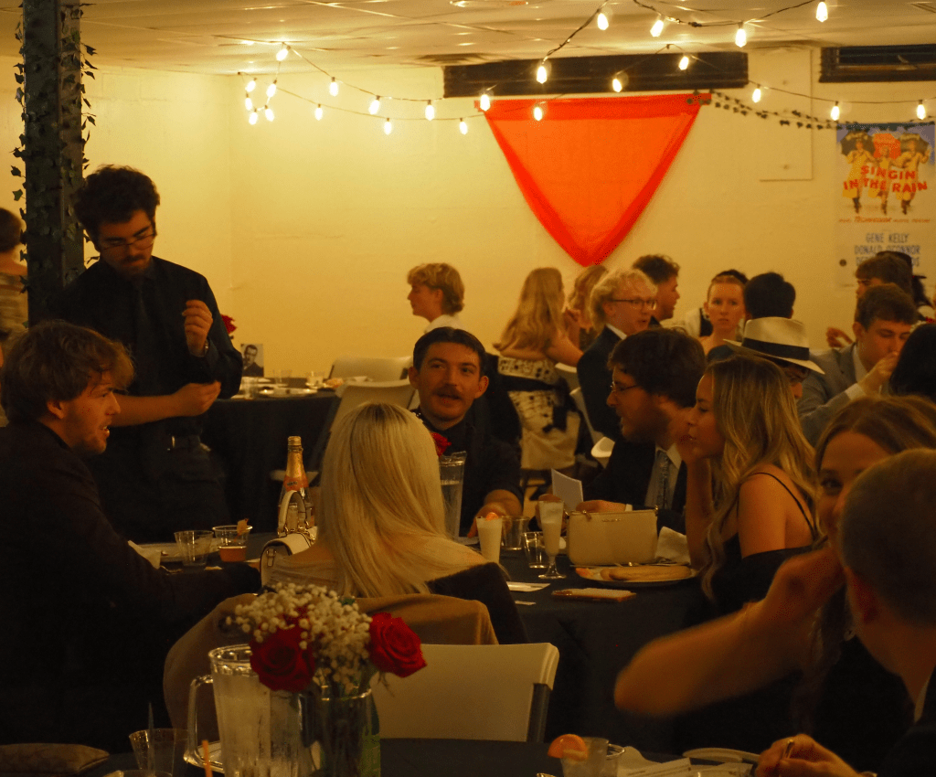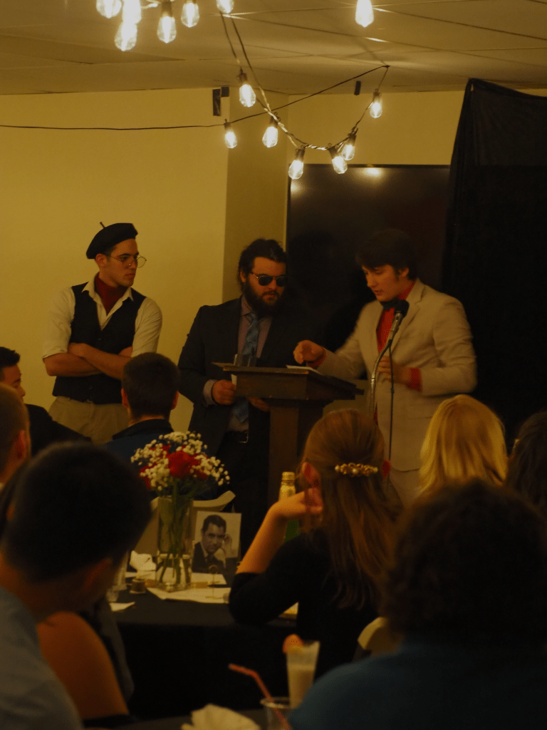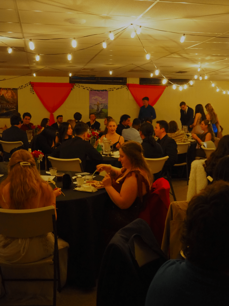 Our theme this year was old Hollywood glamour–our tables featured many actors and actresses from around the 1940s, and the walls were adorned with famous movie posters. We feasted on Italian delight from Olive Garden, and dessert was a fudge brownie topped with ice cream, a cherry, and whipped cream. Our dinner was delightfully accompanied by a lovely live pianist, Michelle Martisek, who performed classic movie themes and pieces from the time period.