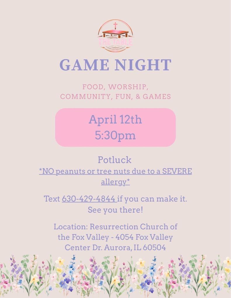 Where: Resurrection Church of the Fox Valley, 4054 Fox Valley Center Dr. Aurora, IL 60504